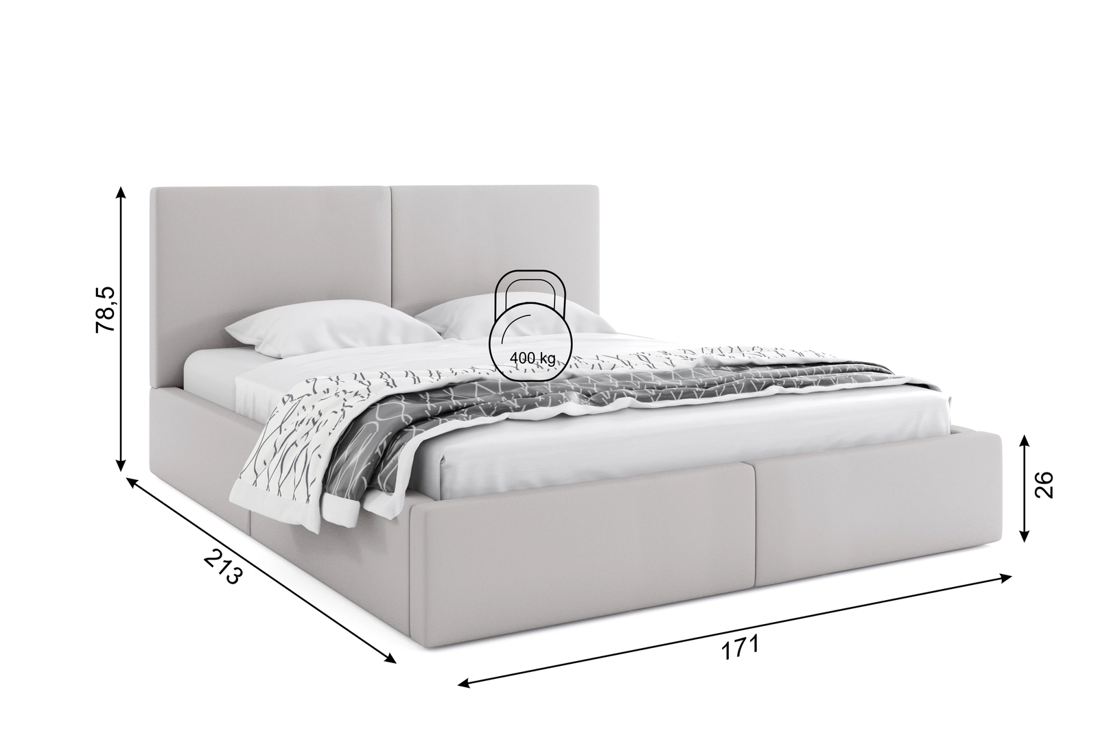 Pat tapițat pentru dormitor HILTON 160X200 cu saltea și cutie de depozitare, gri cenușă