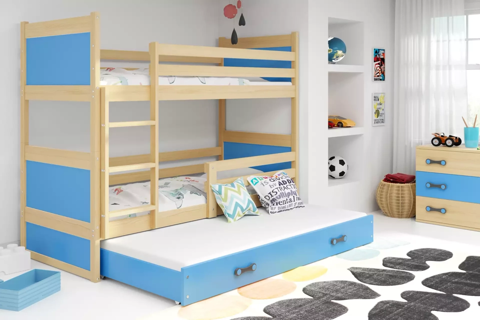 Rico pat supraetajat cu 3 locuri 90x190 cu sertar, pin/albastru